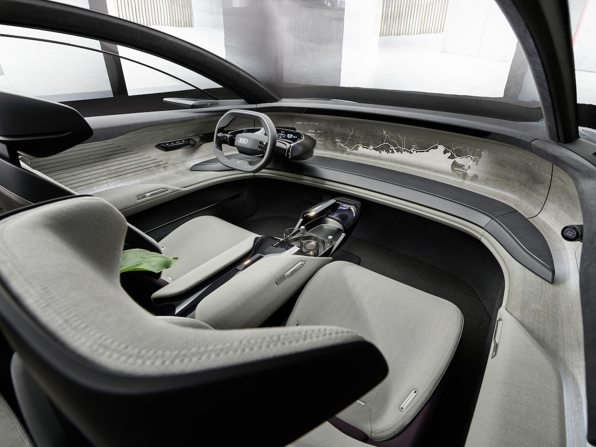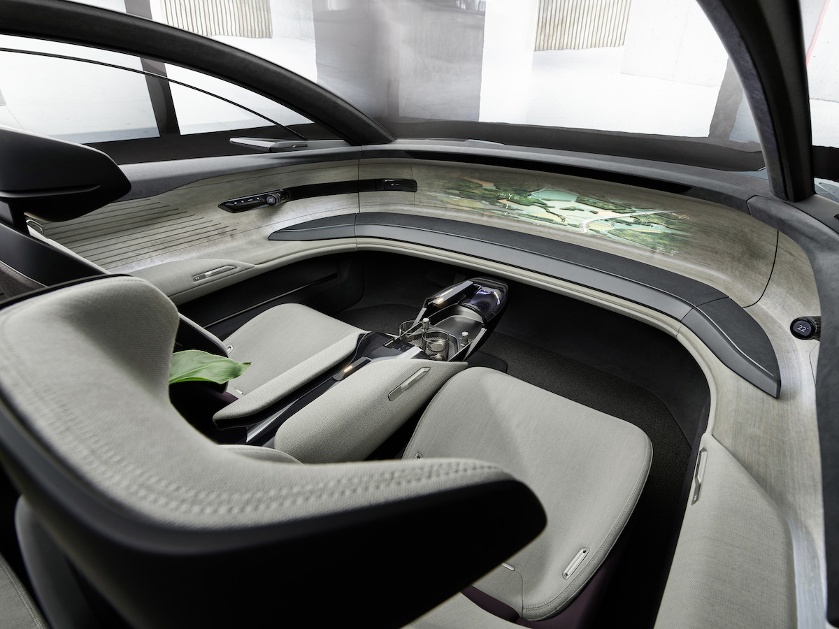 Audi grandsphere'de otonom sürüş etkinleştirildiğinde, göstergeler ve diğer ekranlar ortadan kayboluyor. Bunun yerine, yüksek kalitede malzemelerden yapılmış alanlar ortaya çıkıyor. Tamamı sürdürülebilir ve geri dönüştürülmüş ahşap, yün, sentetik tekstil ve metaldan olan yan kaplamalar, koltuk kaplamaları ve döşemelerin yer aldığı Audi grandsphere'de deri kullanılmıyor. Araç bir parmak dokunuşuyla canlandığında iç ortam farklılaşıyor: sürüş durumuna bağlı olarak, ya tüm iç mekana dağılan ya da sürücü ve ön koltuktaki yolcu için bölümlere ayrılan ekranlar ortaya çıkıyor. Seyahat ederken gerekli olan tüm bilgiler yüksek çözünürlükte ve tam olarak okunabilir şekilde ekranlarda yer alıyor. Alternatif olarak, projeksiyon yüzeyleri, otomatik sürüş modunda, bilgi-eğlence içeriği için CinemaScope ekranları veya video konferans ekranları olarak da kullanılabiliyor. Ayrıca, arzu edildiğinde müzik veya navigasyon için içerikler arası hızlı geçişi sağlamak amacıyla, projeksiyon yüzeylerinin altına bir sensör çubuğu entegre edilmiş. Araçta aktif olan tüm fonksiyonları ve uygulamaları gösteren bu alanda farklı menüler için simgeler yanıp sönüyor.