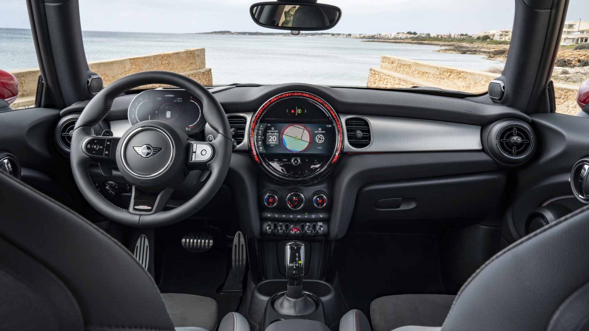 Yeni MINI John Cooper Works standart olarak gelen siyah panel tasarımına sahip 8,8 inç dokunmatik bilgi-eğlence ekranıyla da dikkat çekiyor. Yeniden tasarlanan orta gösterge ekranı araç ayarlarının, ses işlevlerinin ve navigasyonun kontrolünü yapan yeni bir işletim sistemine sahip. Uygulamaları daha da sezgisel hale getiren yeni işletim sistemiyle dokunmatik ekranda bir kaydırma hareketi ile seçilebilen Canlı Pencere Öğeleri de ilk kez sunuluyor. Bilgi-eğlence ve gösterge ekranı iki farklı renkte kişiselleştirilebiliyor. "Lounge" modunda, ekran yüzeyleri rahatlatıcı mavi ve turkuaz tonlarında görünürken, "Sport" modunda ekran arka planları kırmızı ve antrasit renge geçiyor. Ekranların renk seçenekleri Yeni MINI John Cooper Works'te standart olan MINI Sürüş Modlarına bağlanabiliyor. Bu sayede “Sport” sürüş modu etkinleştirildiğinde, gaz pedalı, direksiyon özellikleri, amortisör ve vites seçim özellikleriyle aynı anda ekran rengi de değişebiliyor.